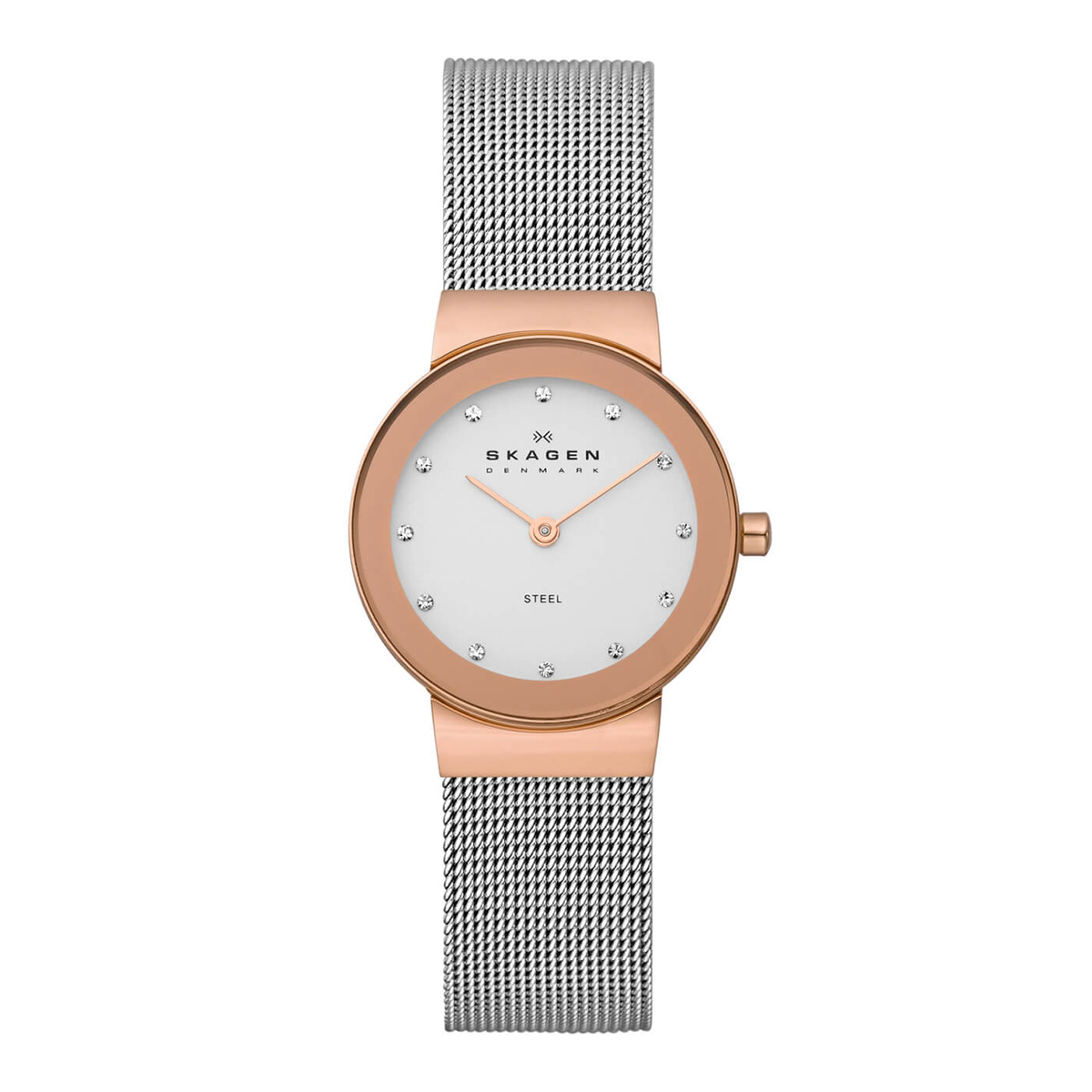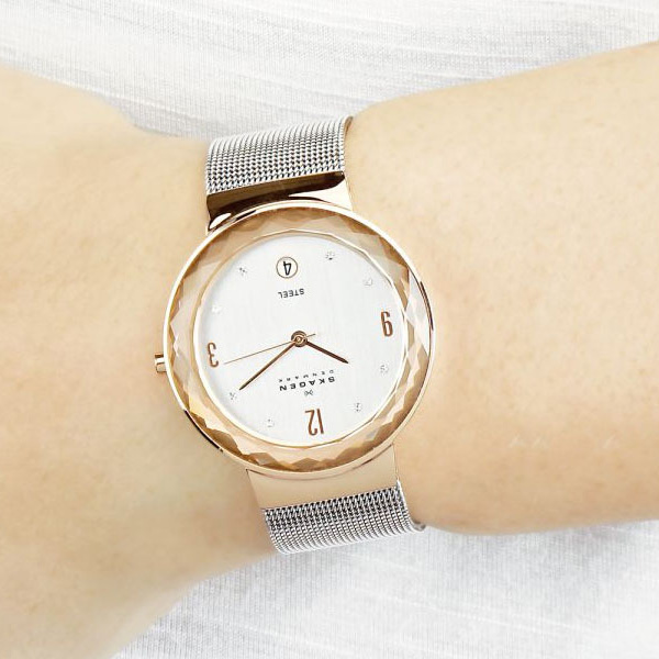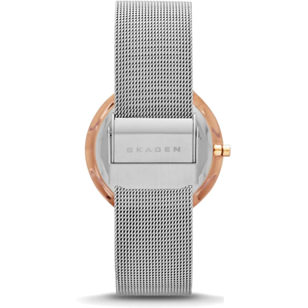 برند اسکاگن برندی امریکایی ست که توسط کمپانی فسیل گروپ (سومین کمپانی ساعت سازی مطرح دنیا) ساخته می شود. موتور این ساعت توسط کمپانی میوتای ژاپن (بزرگترین کمپانی موتورساعت سازی دنیا) ساخته شده و از نوع کوارتز (باتری دار) است. این ساعت در ابعاد قطر قاب 34 میلیمتر ضخامت قاب 8.3 میلیمتر عرض بند 12 میلیمتر طراحی شده است. جنس بند و بدنه این ساعت از استیل ضد حساسیت با کیفیت (318 میکرون) می باشد و برای افرادی که ساعت سایز ظریف میپسندند مناسب است.  مقاومت این ساعت در برابر آب 3 اتمسفر می باشد. این ساعت توسط مرکز گارانتی و دپارتمان تخصصی تعمیرات ساعت آچارواچ داری 5 سال گارانتی معتبر می باشد.
