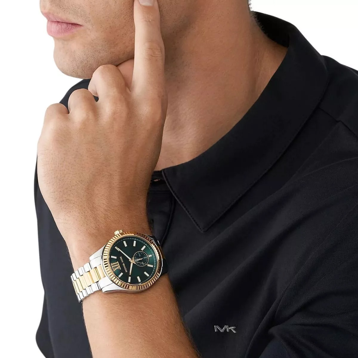 برند مایکل کورس برندی امریکایی ست که توسط کمپانی فسیل گروپ (سومین کمپانی ساعت سازی مطرح دنیا) ساخته می شود. موتور این ساعت توسط کمپانی میوتای ژاپن (بزرگترین کمپانی موتورساعت سازی دنیا) ساخته شده و از نوع کوارتز (باتری دار) است. این ساعت در ابعاد قطر قاب 45 میلیمتر ضخامت قاب 12 میلیمتر عرض بند 22 میلیمتر طراحی شده است. جنس بند و بدنه این ساعت از استیل ضد حساسیت با کیفیت (318 میکرون) می باشد و برای افرادی که ساعت سایزدرشت میپسندند مناسب است.  مقاومت این ساعت در برابر آب 5 اتمسفر می باشد. این ساعت توسط مرکز گارانتی و دپارتمان تخصصی تعمیرات ساعت آچارواچ داری 5 سال گارانتی معتبر می باشد.
